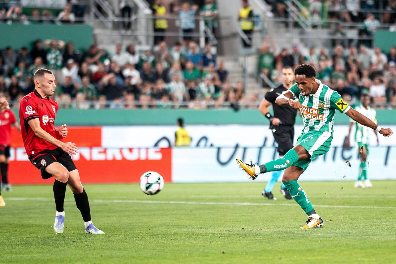 Rapids erster Angriff hätte schon das 500. Europacuptor bringen können. Janis Antise köpfte eine Flanke von Jonas Auer, der als Linksverteidiger den Vorzug gegenüber dem Deutschen Jannes Horn erhielt, an die Stange. Trainer Peter Stöger entschied sich für ein 4-3-3 mit Antiste im Angriffszentrum, Andrija Radulovic und Petter Dahl an den Flanken. Dahl traf zunächst die Stange, nach 17 Minuten jubelte er über ein erstes Tor für Rapid (Bild), das auf einen Stangenschus von Bendegüz Bolla folgte und als 500. Europacuptor in die Geschichte eingeht. Als Montenegros Teamspieler Radulovic zehn Minuten später das 2:0 gelang, hatte es zuvor die Aluminiumtreffer vier und fünf durch Bolla und Antiste, der nach der Pause verletzt ausschied, gegeben. Anders als beim Hinspiel und beim Cupaufstieg in Innsbruck gelangen die Tore nicht aus Standards, sondern aus dem Spiel. „Die erste Hälfte war so, wie ich es mir vorstelle“, kommentierte Rapids Trainer Peter Stöger die beste Offensivleistung dieser kurzen Saison.