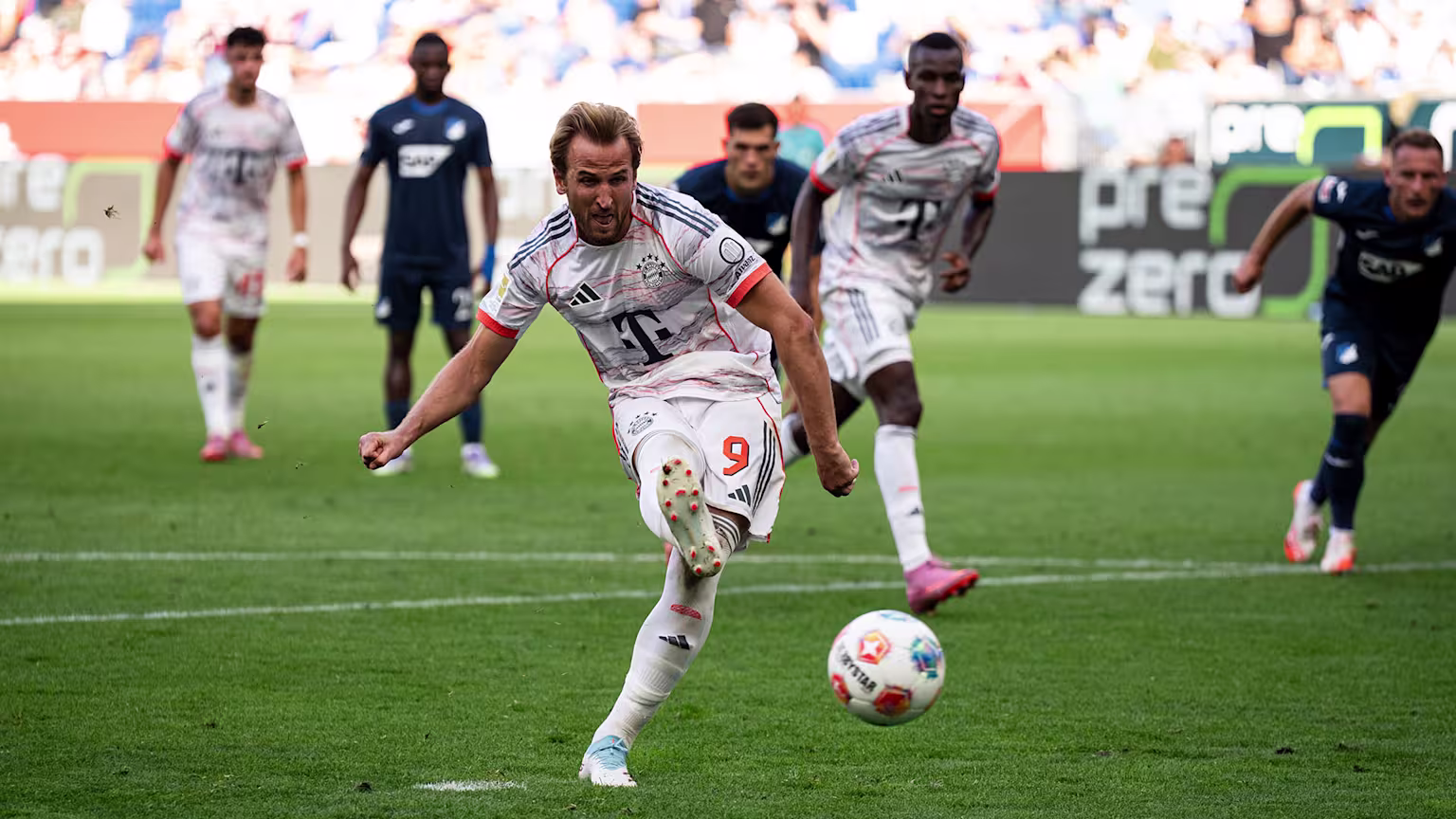 Bayern Münchens beeindruckenden Siegeslauf in der Bundesliga konnte auch Christian Ilzer mit Hoffenheim ncht stoppen. Am Tag der Oktoberfest-Eröffnung feierte der Meister mit 4:1 (1:0) feierte den vierten Sieg in vier Runden, die Tordifferenz beträgt plus 15. Ein beeindruckender Startrekord. Dabei ließ Trainer Vincent Kompany mit Dayot Upamecano, Joshua Kimmich, Michael Olise und Serge Gnabry vier aus der Stammformation auf der Bank, wechselte sie erst nach einer Stunde ein. Vielleicht war dies mit ein Grund, dass Hoffenheim, erstmals mit Alexander Prass in der Startelf, in der ersten Hälfte die bessere Mannschaft war, wie auch Kompany zugab. Aber der Führungstreffer von Kane eine Minute vor der Pause bedeutete schon den Beginn von Hoffenheims Untergang. Kurz nach der Pause verwandelte Kane einen Elfmeter (Bild) zum 0:2, alles andere war nur noch Draufgabe. Das dritte Kane-Tor, das zweite durch einen verwandelten Elfmeter, das Anschlusstor von Hoffenheim aus einem Freistoss, der vierte Bayern-Treffer durch Gnabry in der 99. Minute: „Jede Niederlage schmerzt“, musste Ilzer eingestehen.