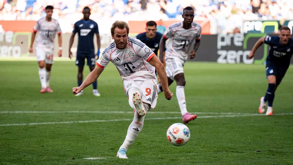 Bayern Münchens beeindruckenden Siegeslauf in der Bundesliga konnte auch Christian Ilzer mit Hoffenheim ncht stoppen. Am Tag der Oktoberfest-Eröffnung feierte der Meister mit 4:1 (1:0) feierte den vierten Sieg in vier Runden, die Tordifferenz beträgt plus 15. Ein beeindruckender Startrekord. Dabei ließ Trainer Vincent Kompany mit Dayot Upamecano, Joshua Kimmich, Michael Olise und Serge Gnabry vier aus der Stammformation auf der Bank, wechselte sie erst nach einer Stunde ein. Vielleicht war dies mit ein Grund, dass Hoffenheim, erstmals mit Alexander Prass in der Startelf, in der ersten Hälfte die bessere Mannschaft war, wie auch Kompany zugab. Aber der Führungstreffer von Kane eine Minute vor der Pause bedeutete schon den Beginn von Hoffenheims Untergang. Kurz nach der Pause verwandelte Kane einen Elfmeter (Bild) zum 0:2, alles andere war nur noch Draufgabe. Das dritte Kane-Tor, das zweite durch einen verwandelten Elfmeter, das Anschlusstor von Hoffenheim aus einem Freistoss, der vierte Bayern-Treffer durch Gnabry in der 99. Minute: „Jede Niederlage schmerzt“, musste Ilzer eingestehen.