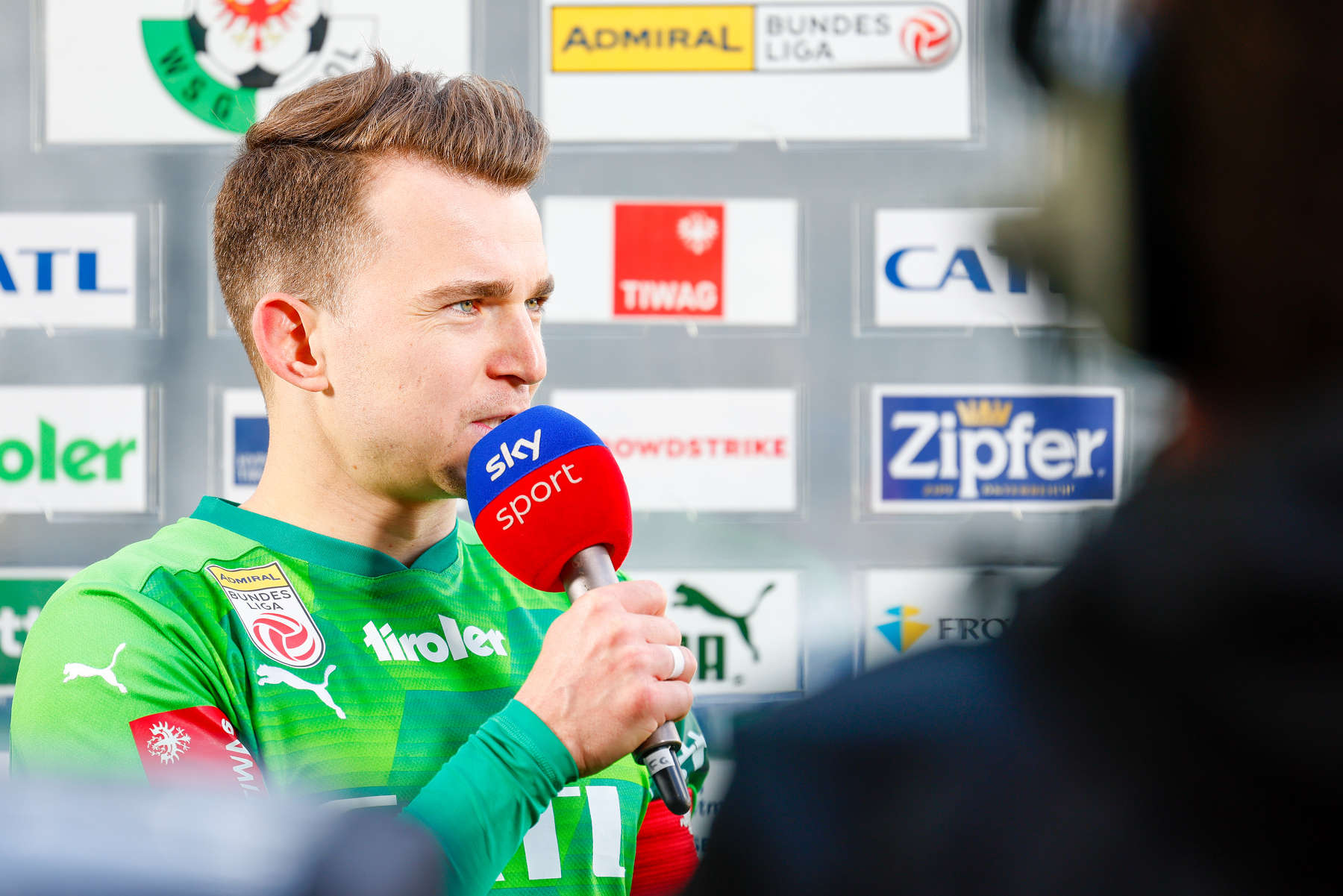 Viel fehlte nicht und Rapid wäre auch mit dem ersten Sieg seit November, dem 2:0 gegen Wolfsberg, nicht unter die ersten sechs gekommen. Denn Ried war am Innsbrucker Tivoli gegen WSG Tirol lange auf der Siegesstraße, dominierte die erste Hälfte klar, führte aber nach 17 Torchancen nur durch einen Treffer von Antonio van Wyk 1:0. Den Chancen nach wäre mehr möglich gewesen, Abwehrriese Niki Havenaar traf per Kopf nur die Latte. Nach der Pause kassierte Ried im 100. Spiel mit Maximilian Senft als Trainer erstmals in dieser Saison ein Tor nach einem Eckball. Tirols Kapitän Valentino Müller (Bild) hielt mit seinem neunten Saisontreffer Rapid auf Platz sechs. Ried ist nach dem 1:1 einen Punkt hinter Rapid auf Platz sieben. Hat aber in den letzten zwei Runden des Grunddurchgangs die günstigere Auslosung als Rapid. In Graz gegen den GAK und daheim gegen die Austria, Rapid muss zum nächsten Finale nach Altach, dann kommt Tabellenführer Salzburg nach Hütteldorf. Anders als Rapid spielt Ried noch in zwei Bewerben: zwischen GAK und Austria gibt es das Cupsemifinale gegen den LASK. „Es ist für einen Aufsteiger schon beachtlich, in dieser Situation zu sein“, meine Senft, „das letzte Heimspiel gegen die Austria wird entscheidend!“
